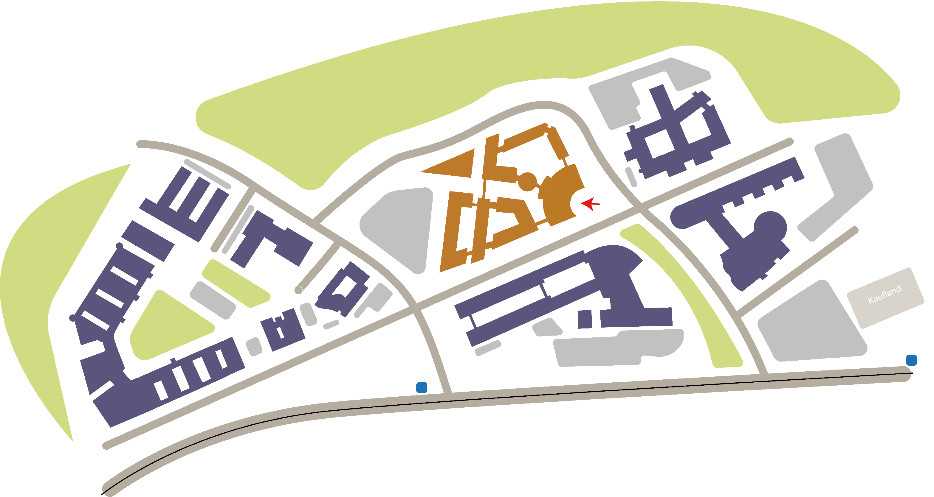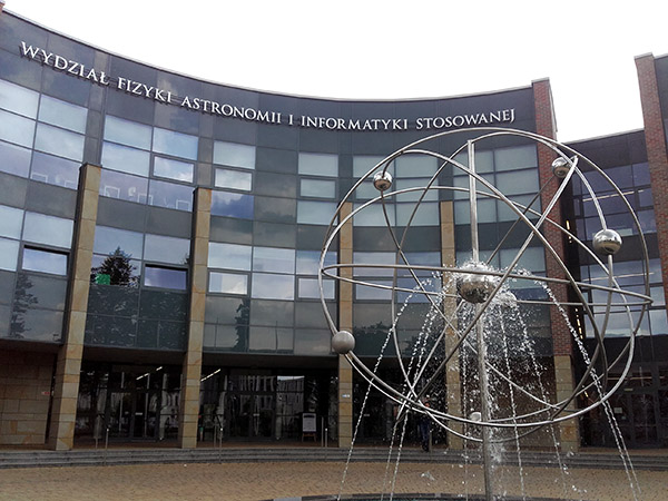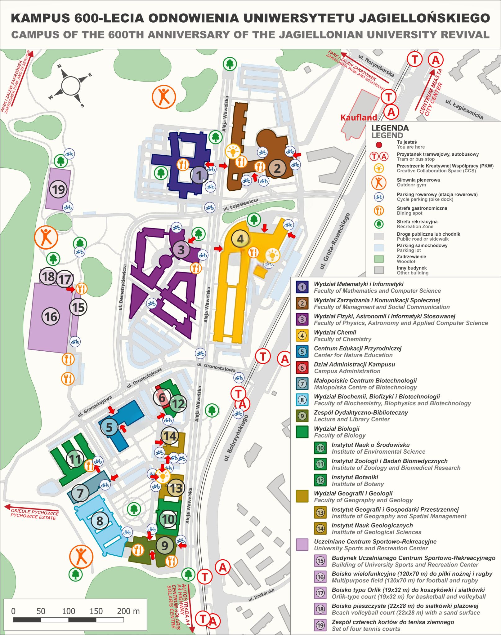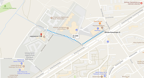 You can get to the Jagiellonian University Campus from the Main Railway Station by tram number 52 in the direction of Czerwone Maki P + R. Line 52 runs approximately every 10 minutes. Journey time approx. 30 minutes. Get off at Norymberska or Ruczaj stop. The campus map with marked buildings is below. The building of the Faculty of Physics, Astronomy and Applied Computer Science (WFAIS) of the Jagiellonian University is marked in orange. Other university buildings in blue. The red arrow marks the main entrance to the WFAIS building. The nearest tram stops are marked with blue squares. It is approx. 500 m from the Norymberska stop to the main entrance to WFAIS, and 400 m from the Ruczaj stop.